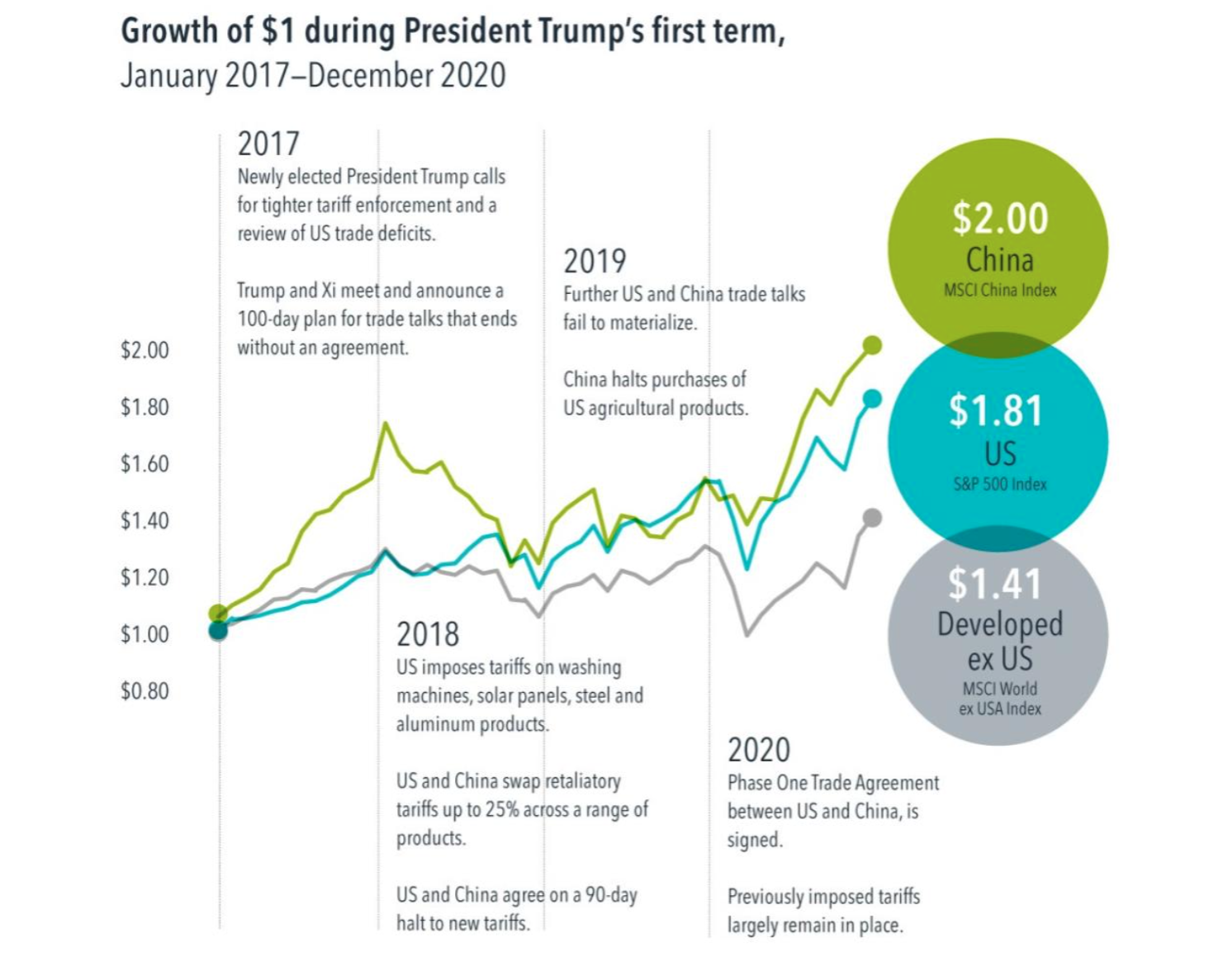 We don’t have to look far for a meaningful data point. A recent period offering perspective on this issue is President Trump’s first term in office. Beginning in 2017, the administration eyed China as a target, and by 2018, they began imposing tariffs across a range of products. The next couple of years saw back-and-forth trade discussions that eventually led to an agreement, though preexisting tariffs remained in place. Despite a wave of forecasts to the contrary, China posted higher cumulative returns than the US and the MSCI World ex USA Index over the four years of Trump’s term.